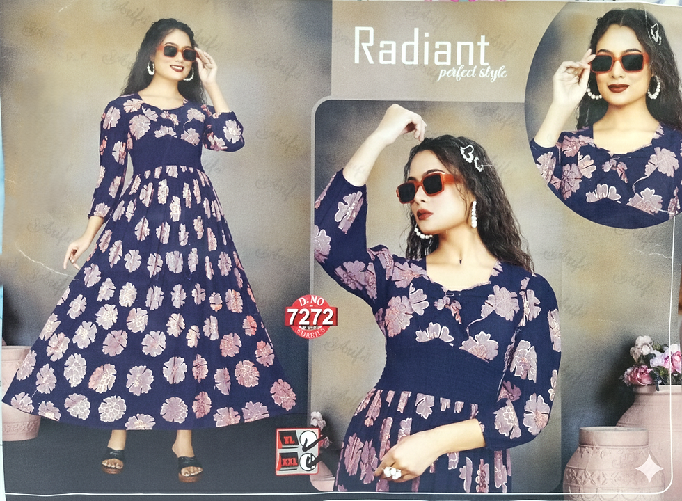 Elegant Knee-Length Navy Floral Print Rayon Gown with Waist