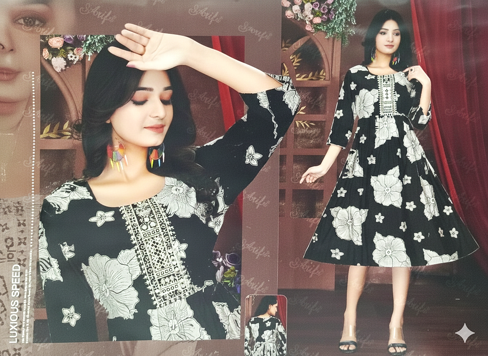 Black & White Floral Printed Rayon Knee-Length Flair Dress